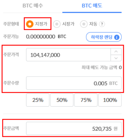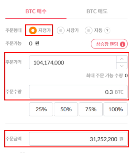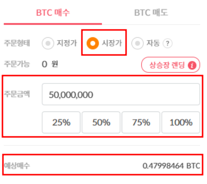 6. 빗썸 매수 시 주문가격과 수량을 원하는 만큼 입력하시면 주문금액이 얼마인지 바로 확인하실 수 있습니다. 그리고, 시장가로 바로 매수하고 싶다면 시장가 탭을 클릭하신후 주문하시면 됩니다.
