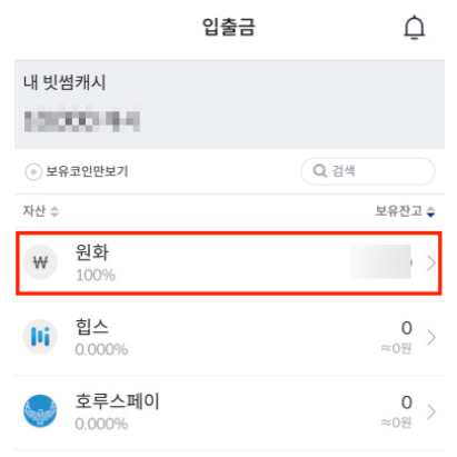 2. 입출금 클릭 후 '원화'를 선택해서 클릭해주시면 됩니다.