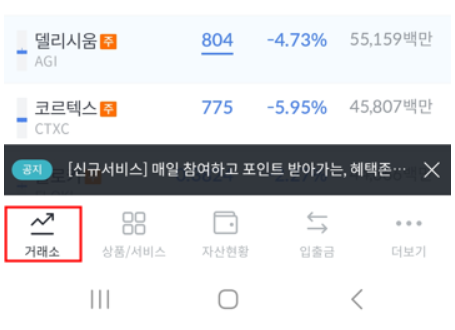 4. 거래할 금액을 입금하셨다면 이젠 거래할 코인을 검색하기 위해서 하단의 '거래소' 탭을 클릭해주시면 됩니다.