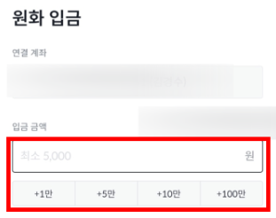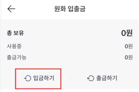 3. 원화 입출금 창이 뜨면, 하단에 입금하기 또는 출금하기 탭 중 '입금하기'를 클릭해주시면 됩니다. 거래할 금액을 입금해주시면 됩니다.