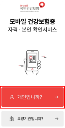 2. 앱 다운로드 및 설치를 하신 후, 앱을 실행하시면 아래와 같이 사용자 유형을 선택하라는 창이 뜹니다. '개인입니까?' 버튼을 클릭해주시면 됩니다.