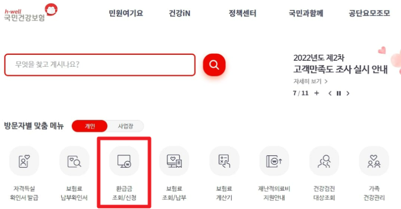▶ 사업장(개인, 법인) : 인터넷, 고객센터에서 환급금 조회 후 관할지사에 신청서 및 서류 제출