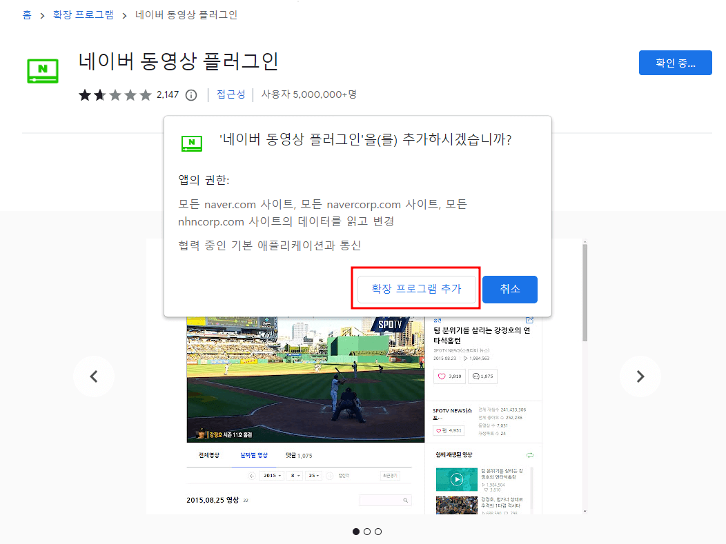 3. 네이버 동영상 플로그인이 설치되면 Chrome에 추가 되었다는 팝업창이 뜹니다.
