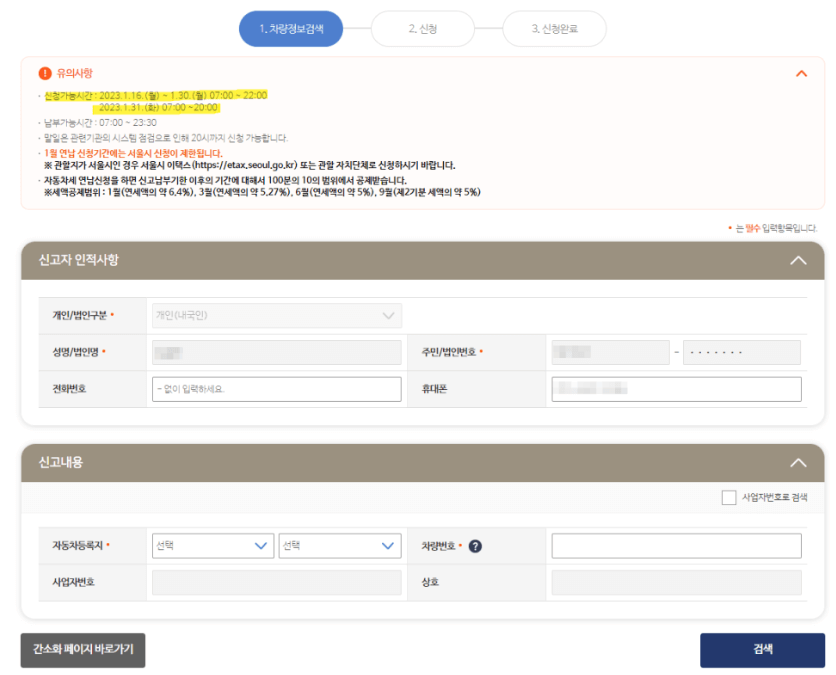 3. 개인정보와 신고내역을 작성합니다. 신청 후 계좌이체 또는 신용카드로 결제하시면 끝납니다.