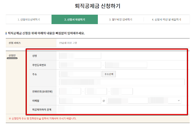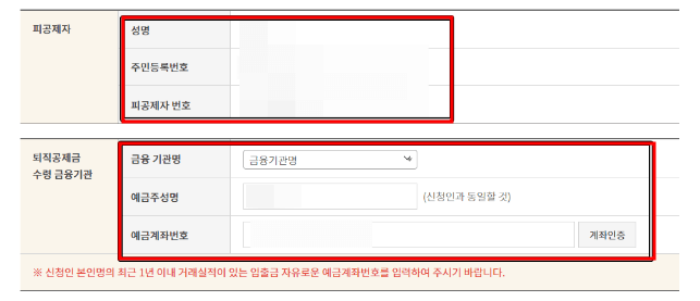6. 신청자의 기본 인적사항, 퇴직금 수령 금융기관, 고제 가능 정보등을 신청서에 입력합니다.