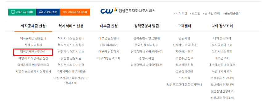 2. 퇴직 공제금 신청 클릭 후 하위 메뉴에서 퇴직공제금 신청하기를 클릭하시면 됩니다.