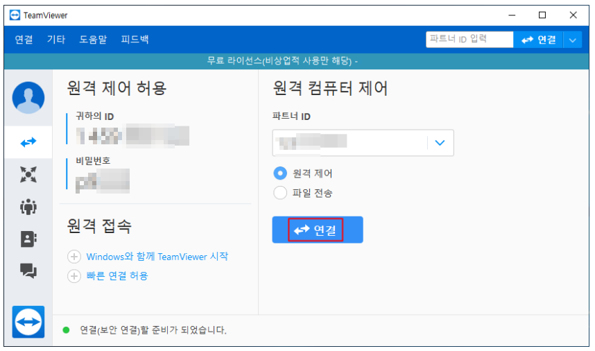 ▶ 팀뷰어를 설치하고 실행하면 아래와 같은 화면이 나오게 됩니다. 원격제어 허용에서 귀하의 아이디와 비밀번호를 확인할 수 있습니다. 아이디는 고정되어 있고, 매번 실행시 비밀번호는 바뀌게 됩니다. 원격제어를 받으려는 컴퓨터에 나온 팀뷰어 ID 를 그대로 파트너 ID에 입력을 해주시고 연결을 클릭해주시면 됩니다.