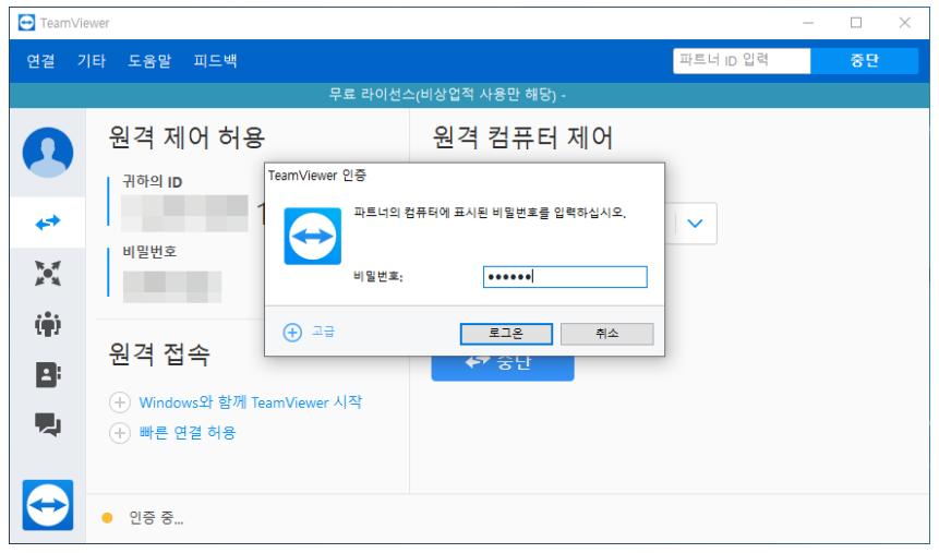 ▶ 다음으로 파트너의 컴퓨터에 표시된 팀뷰어 비밀번호를 입력하시고 로그온 하시면 원격으로 연결이 됩니다.