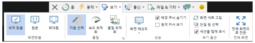 ▶ 상단 메뉴에서는 화면의 맞춤 크기를 조절할 수 있으며, 속도나 품질 최적화도 해볼 수가 있습니다. 전체화면으로 원격제어를 이용할 수도 있습니다. 통신을 선택하면 통화나 채팅을 할 수 있으며 채팅기능을 활용하여 원격제어를 하면서 필요한 대화를 나눌수도 있습니다.