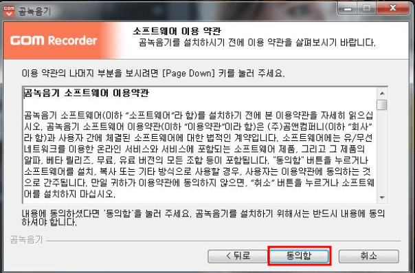 3. 곰 녹음기 소프트웨어 이용 약관에 '동의함'을 클릭해주시면 됩니다.