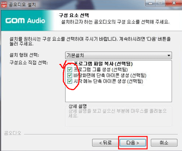 ▶ 구성요소 선택화면에서 '다음'을 클릭해주시면 됩니다. 바탕화면 및 시작 메뉴에 단축아이콘을 생성하시려면 체크박스에 체크를 하시고 설치하시면 됩니다.