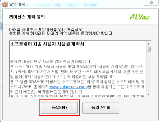 1. 다운받은 실행파일을 클릭하여 알약 설치를 실행시킨 후 라이선스 계약 동의에서 '동의'를 클릭해주시면 됩니다.