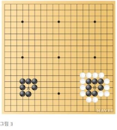 ▶ 착수금지점의 규칙 : 바둑에서는 기본적으로 반상 어디에나 착점 할 수 있지만 예외적으로 둘수 없는 곳이 있습니다. 그림3-A처럼 이미 상대로부터 사방이 완전히 둘러싸여 있는 곳에는 착점할 수 없습니다. (에외로 그림3-B처럼 그곳에 놓아 상대의 돌 전체를 곧바로 따낼수 있을때는 백의 입장에서 착수금지점이 아니며, 오히려 흑의 착수금지점이 됩니다.)