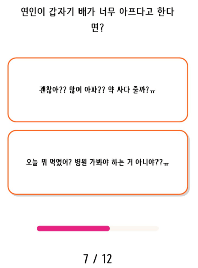 7번째 문항은 연인이 갑자기 배가 너무 아프다고 한다면 나는 어떻게 할건지 생각해보시고 선택하시면 됩니다.