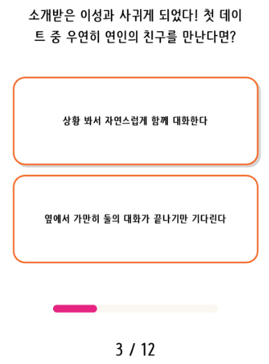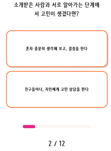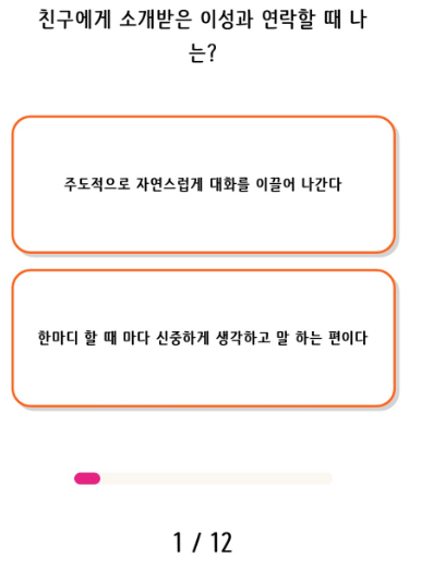 연애 프로파일 테스트를 시작하시면 총 12가지 문항으로 구성되어 있는 질문을 받으시게 됩니다. 질문에 대한 답은 2가지가 있으며, 이 중 한가지를 선택하시면 됩니다.