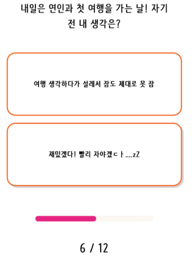 6번째 문항은 내일 연인과 첫 여행을 가는날 자기전 내 생각은 무엇인지 잘 생각해보시고 선택하시면 됩니다.