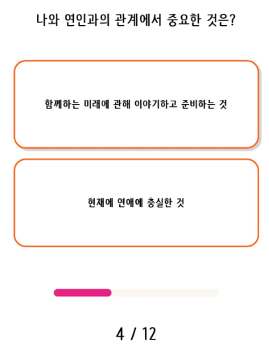 4번째 문항에서 나와 연인과의 관계에서 중요한 것은 무엇인지 잘 생각해보시고 선택하시면 됩니다.