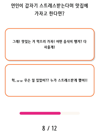 8번째 문항은 연인이 갑자기 스트레스 받는다며 맛집에 가자고 한다면 나는 어떻게 할건지 생각해보시고 선택하시면 됩니다.