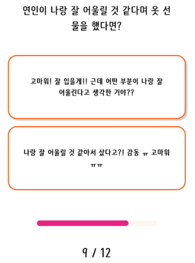 9번째 문항은 연인이 나랑 잘 어울릴 것 같다며 옷 선물을 했다면 나는 어떻게 할건지 생각해보시고 선택하시면 됩니다.