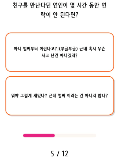 5번째 문항인 친구를 만난다던 연인이 몇 시간 동안 연락이 안된다면 나는 어떻게 할건지 생각해보시고 선택하시면 됩니다.