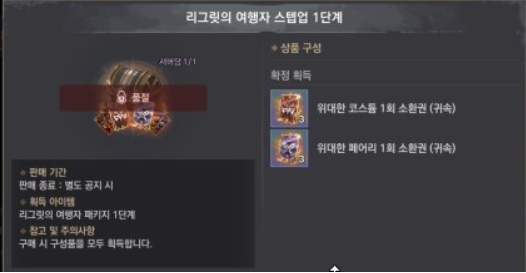 리그릿 여행자 스텝업 1단계 패키지에서는 코스튬 1회 소환권, 페어리 1회 소환권이 각 3장씩 들어있습니다. 3장씩 코스튬과 페어리를 뽑을 수 있다는 것입니다. 서버당 1회 구매가 가능하기 때문에 이를 이용해서 리세마라를 하면 됩니다. 서버마다 캐릭터를 생성해 해당 상품을 구매하신 후 리세마라를 하는겁니다. 무과금으로 하시려는 유저라면 꼭 이를 명심하셔서 진행해 보시기 바랍니다.