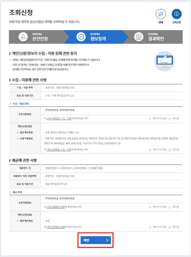 ▶ 개인정보 수집/이용 등에 관한 동의에서 '동의함'으로 모두 체크하신 후 '확인'을 클릭해주시면 됩니다.