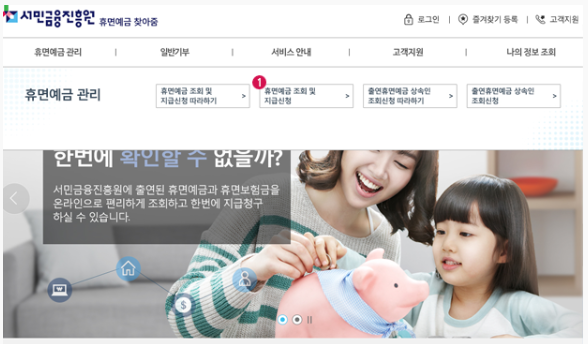 ① 상단 메뉴의 휴면예금 관리 - 휴면예금 조회 및 지급 신청 클릭해주시면 됩니다.