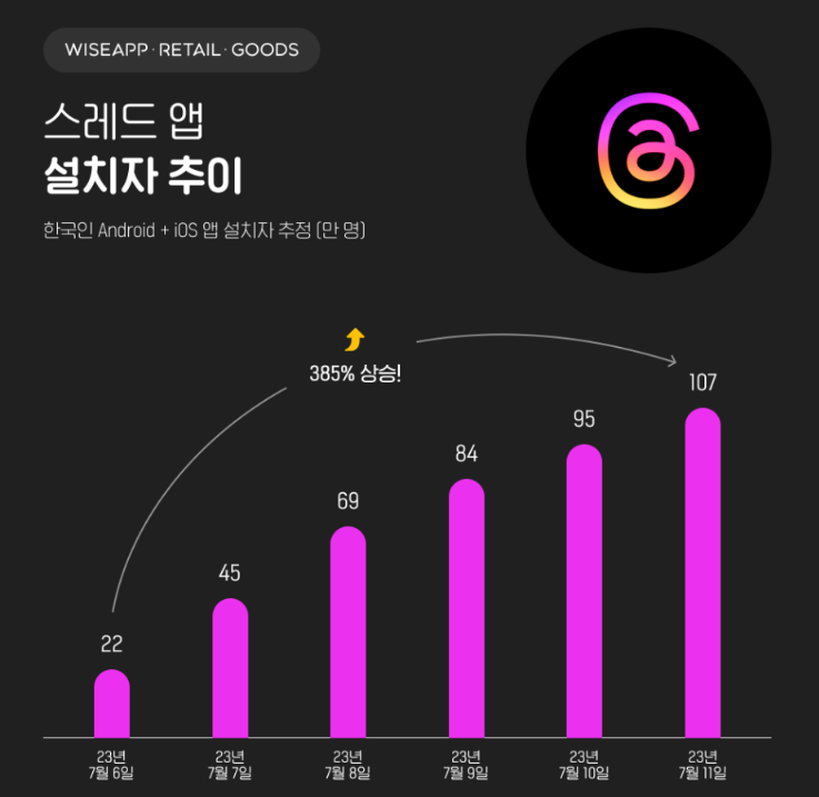 한국에서도 이미 설치한 사람들이 100만명을 돌파할 정도로 인기가 치솟고 있습니다. 전 세계적으로 이미 스레드의 상승세는 엄첨 가파르게 올라가고 있으며, 출시 3일 만에 전 세계적으로 7천만명이 넘는 가입자가 생겨다고 합니다.
