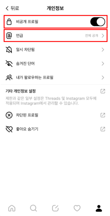 ▶ 개인정보에서 비공개 프로필을 누르면 자신의 프로필을 비공개 설정하실 수 있습니다. 그리고, 언급의 경우 자신을 언급할 수 있는 허용대상을 설정할 수 있습니다.