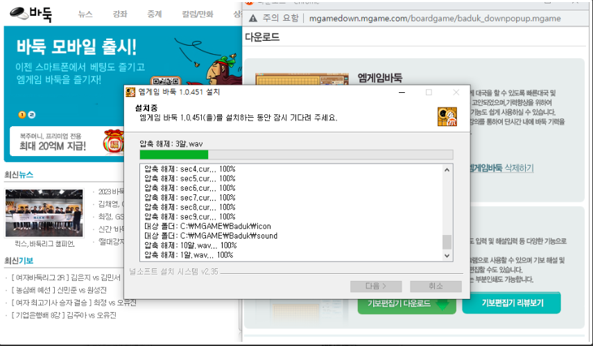 ▶ '엠게임 바둑 다운로드' 버튼을 클릭해주시면 설치 마법사가 설치를 바로 시작하고 설치는 금방 완료 됩니다.