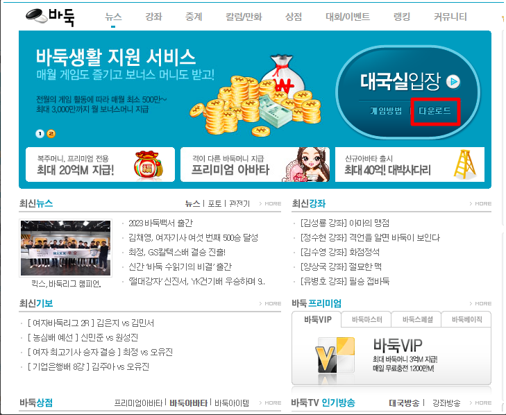 ▶ 엠게임 바둑을 즐기기전에 먼저 다운로드를 받아 설치를 하셔야 합니다. 대국실 입장 버튼 밑에 '다운로드' 버튼을 클릭해주시면 됩니다.