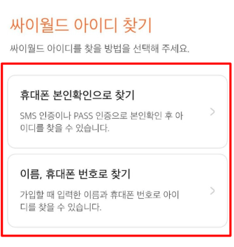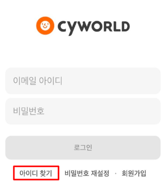 ▶ 싸이월드을 실행시킨 후 '아이디 찾기'를 클릭해주시면 됩니다.