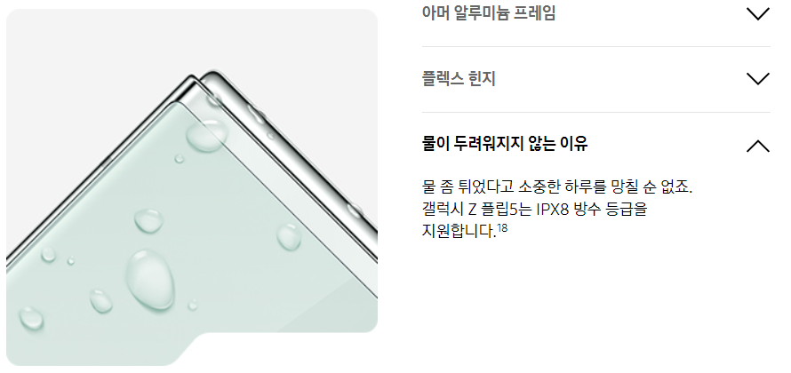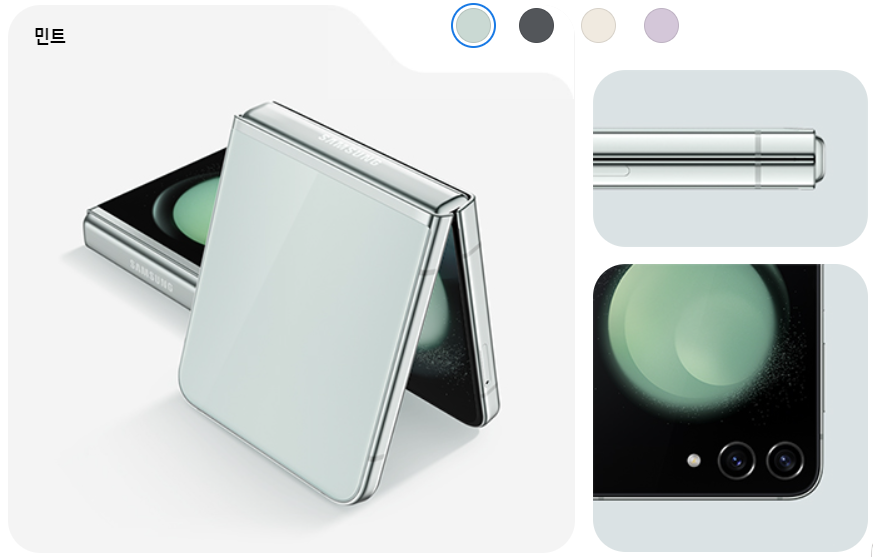 갤럭시 Z 플립5는 나를 온전히 표현할 수 있는 86.1 mm 플렉스 윈도우를 선보입니다. 어느 각도에서나 시선을 사로잡는 디자인과 미니멀한 사이즈로 뛰어난 휴대성은 기본, 다재다능한 능력까지 겸비한 폴더블입니다.
