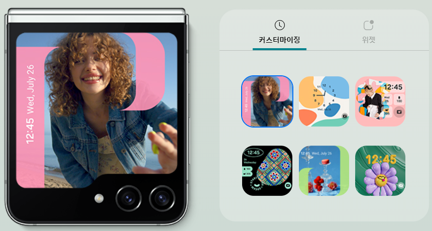 플렉스 윈도우를 나에게 완전히 맞춰보세요. 다양한 위젯, 비디오 월페이퍼, 시계 화면, 스타일 등으로 커스터마이징하여 오직 나만의 갤럭시 Z 플립5로 만들어 보세요.
