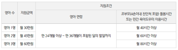 서울시에서 손자손녀를 돌봐주시는 조부모(4촌 이내 친인척 포함)가 영아를 돌보는 경우 또는 서울시에서 지정한 민간기관의 육아도우미 서비스를 이용 시 돌봄 비용을 지원하여 가정의 양육부담을 경감시켜주려고합니다. 자녀세대의 중위소득 150% 미만이면 양육수당 30만원을 받을 수 있습니다.