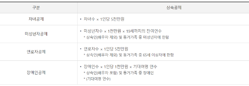 - 자녀공제는 미성년자공제와 중복 적용되며, 장애인공제는 자녀/미성년자/연로자공제 및 배우자공제와 중복 적용이 가능합니다.
