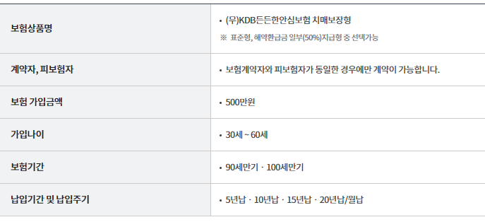 중증치매만 보장하는 상품의 경우 경증 치매로는 보험금 보장을 받을 수 없기 때문에 보험 가입조건에 경도/경증 치매를 보장하는 상품인지 확인을 필수로 해야합니다.