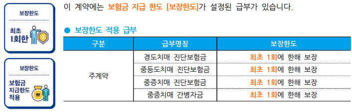 - 이 계약은 치매보장을 주목적으로 하는 보장성보험이며, 저축이나 연금수령을 목적으로 가입하시기 적합하지 않습니다.