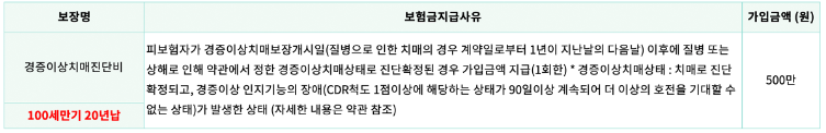 - 과거 경증 치매를 보장하는 보험은 소수에 불과했지만, 지속적인 금융당국의 개선 요구 등으로 상당수의 상품이 경증 치매를 보장하고 있습니다. 중증치매만 보장하는 상품의 경우 경증 치매로는 보험금 보장을 받을 수 없기 때문에 보험 가입 조건에 경도-경증 치매를 보장하는 상품인지 확인을 필수로 해야 합니다.