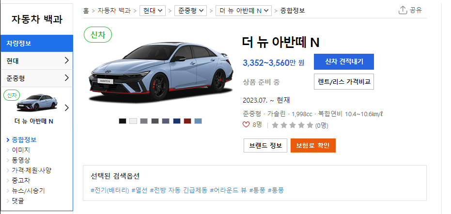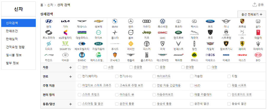본인이 원하는 옵션(전기차, 열선, 전방 자동 긴급제동, 어라운드뷰, 운전석/동승석 통풍)을 선택하시면 다나와 자동차에서는 옵션에 적합한 차량을 찾아줍니다. 신차 견적내기 및 렌트/리스 가격 비교까지 하실 수 입습니다. 간단하게 본인이 원하는 차량의 색상도 확인하실 수 있습니다.