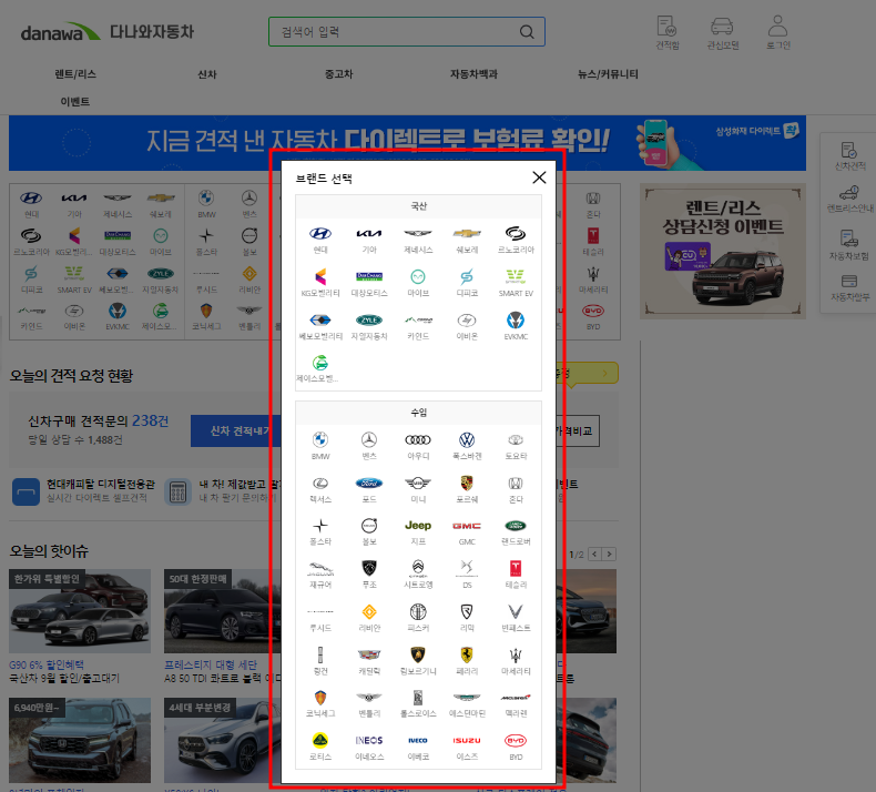 신차 견적내기 버튼을 클릭해주시면 국산/수입 차량 브랜드별 선택 창이 뜹니다. 원하시는 브랜드를 선택하시면 됩니다.