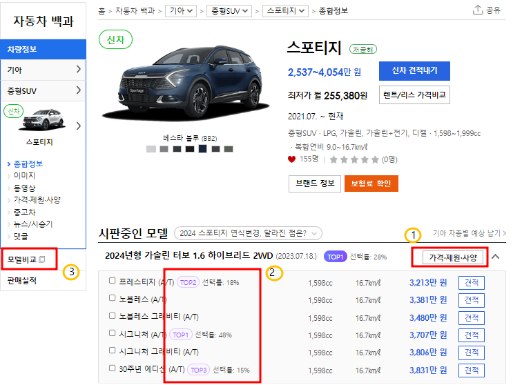② 스포티지 모델별 많은 사람들이 어떤것을 선택했는지 확인해실 수 있습니다.