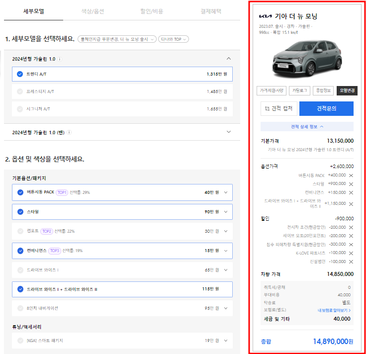 처음에는 기본 차량가격으로 책정되어 있지만, 세부모델, 색상/옵션, 할인/비용, 결제혜택 등 원하시는 사양을 선택해주시면 최종 차량가격을 확인하실 수 있습니다.