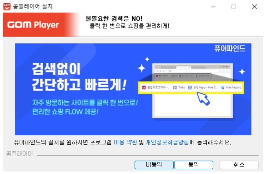 ▶ 곰플레이 설치 중 위 옵션 창이 나타나면 비동의를 권장해 드립니다. 미디어만을 이용하실 분들은 굳이 설치하실 필요가 없습니다.