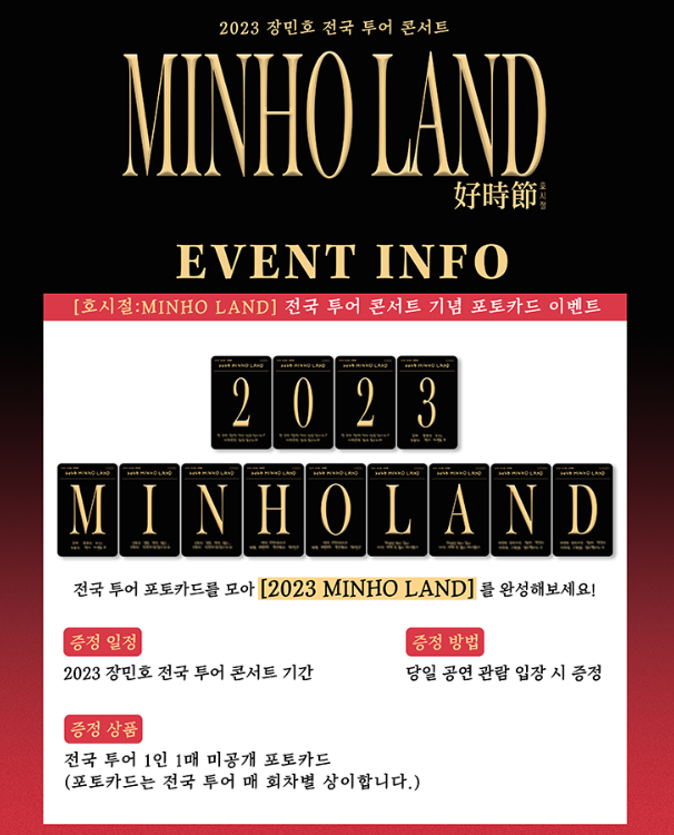 장민호 전국 콘서트를 기념하며, 팬 여러분들을 위한 특별한 이벤트가 마련되었습니다! 바로 '2023 MINHO LAND 를 완성해보세요'인데요, 이번 콘서트에서만 만날 수 있는 1인 1매 미공개 포토 카드를 드립니다.