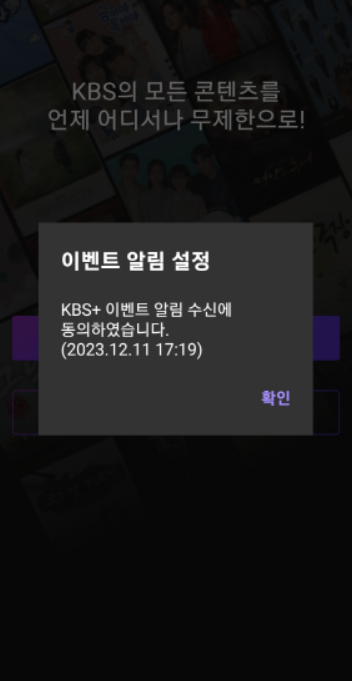 ▶ KBS 온에어 앱을 설치하신 후 클릭하시면 서비스 이용을 위해 동위가 필요한 내용을 확인해주신 다음 하단의 '확인했습니다.' 버튼을 클릭해주시면 됩니다.