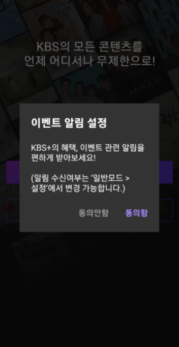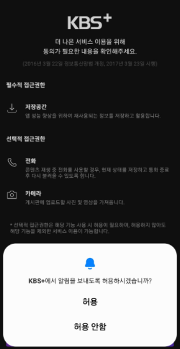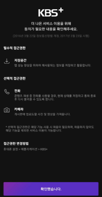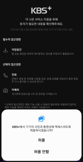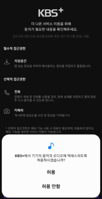 ▶ '확인했습니다.'을 클릭하시면, KBS+ 알림, 음악&오디오, 사진&동영상에 액세스하도록 허용/허용 안함 중에 선택해주시면 됩니다.