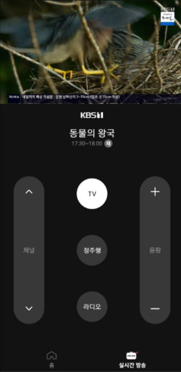 ▶ '실시간 TV 시청하기'를 선택하시면 간단하게 리모컨 처럼 채널, 음향을 조작할 수 있는 버튼이 나옵니다. 시청하고 싶은 채널을 선택하셔서 시청하시면 됩니다.
