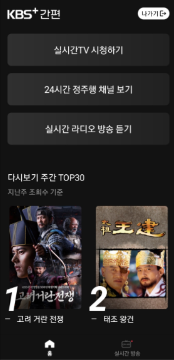 ▶ 간편모드를 선택하시면 '실시간 TV 시청하기', '24시간 정주행 채널보기', 실시간 라디오 방송 듣기' 3가지 선택 버튼이 나옵니다.