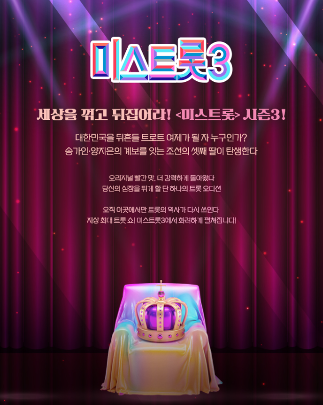 대한민국 예능의 새로운 장을 연 '미스 트롯 시즌 3'에 여러분을 초대합니다! 이번 시즌은 단순한 오디션을 넘어선, 트로트의 진정한 매력을 선사할 준비가 되어 있습니다. 송가인, 양지은과 같은 스타들을 배출한 이 무대 위에서, 새로운 트로트 여왕의 탄생을 기대해 보세요.